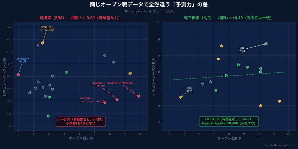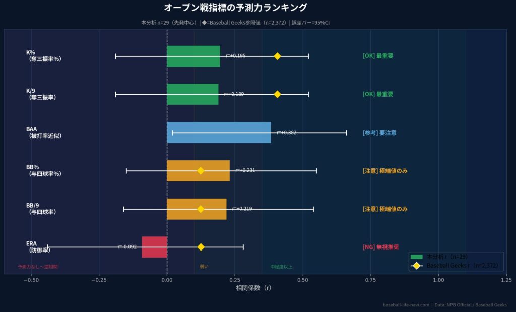 今回の小サンプル(n=29)では、被打率のみが有意という予想外の結果となりました。しかし、信頼区間が極めて広いため、これは偶然の産物である可能性が高いです。重要なのは、大規模研究の序列(K系 > BB系 > ERA)と今回の方向性が一致している点です。ERA(防御率)に至っては相関係数がほぼゼロ(-0.092)であり、「オープン戦の失点はシーズンの活躍を何ら保証しない」ことを改めて裏付ける結果となりました。