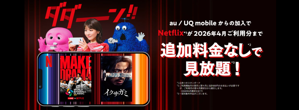 KDDIは、2025年12月1日〜2026年4月30日まで、Netflix月額料金から890円を割引するキャンペーンを案内しています。