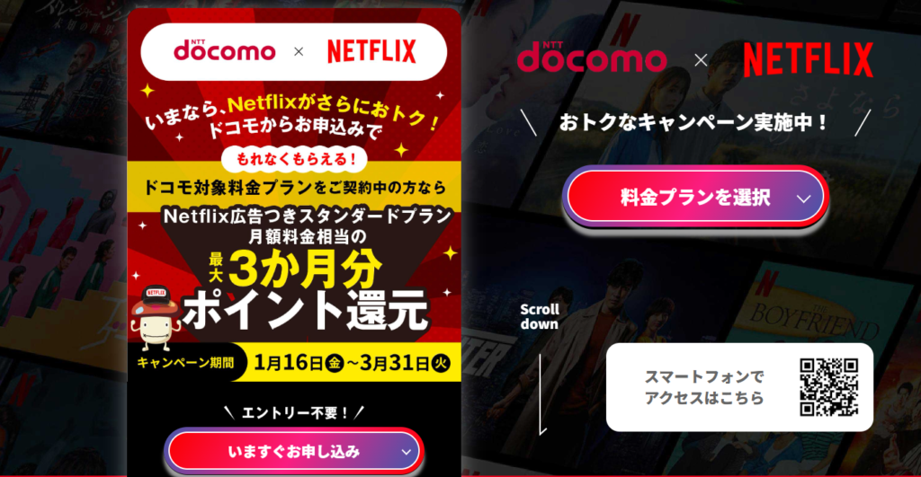 ドコモは2026年1月16日〜3月31日に、対象プラン契約者がドコモ経由でNetflixに新規申込するとdポイント(期間・用途限定)を進呈するキャンペーンを案内しています。